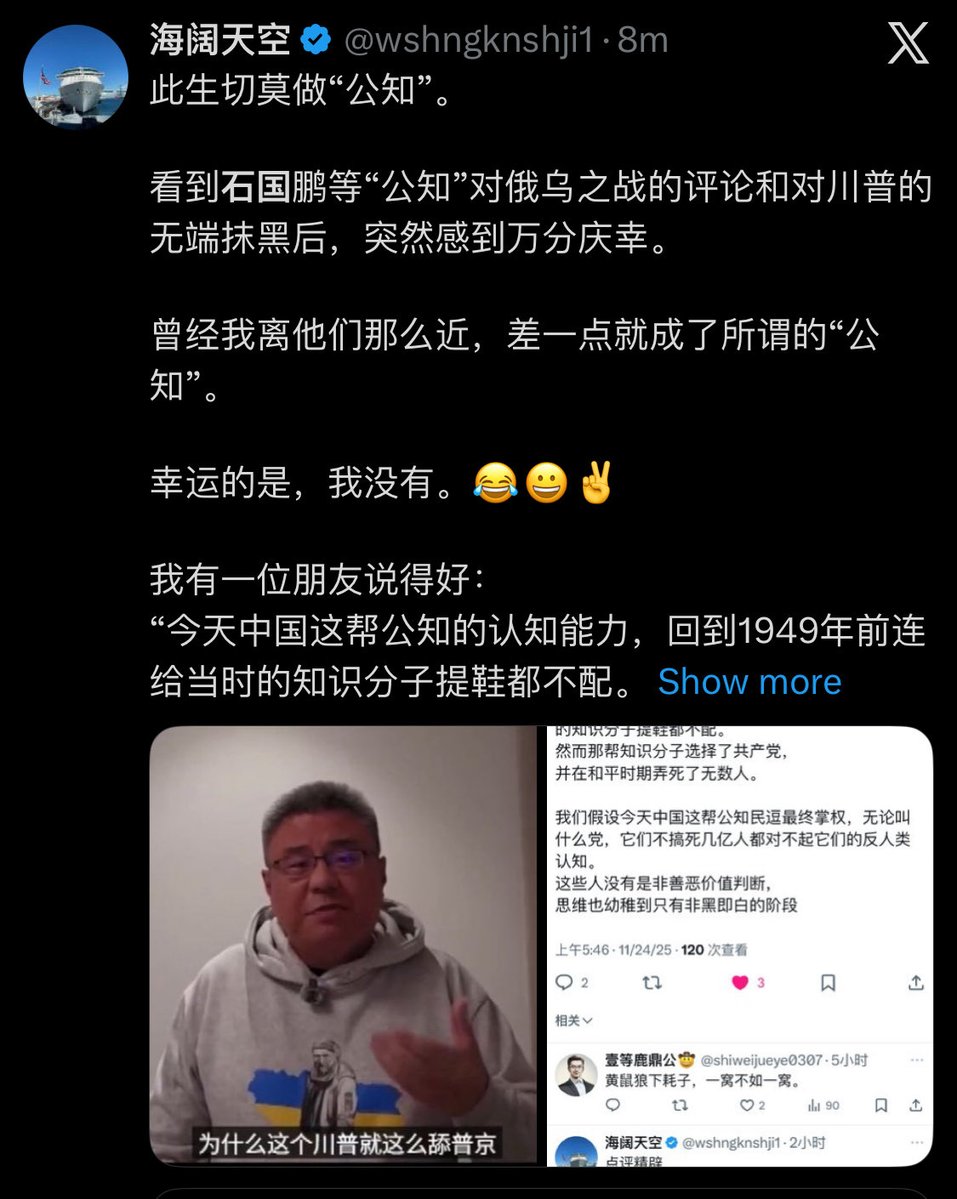 最后当然要为石老师点赞👍。他以前也支持过川普,但他依旧能根据看到的事实及时分析,调整自己的观点,而不是像高瑜他们那样的刻舟求剑,抱着自己原有的想法过一生。
