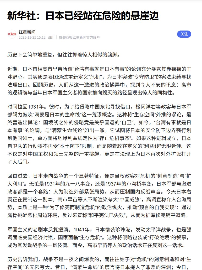 11月25日,新华社宣布:日本已经站在危险的悬崖边