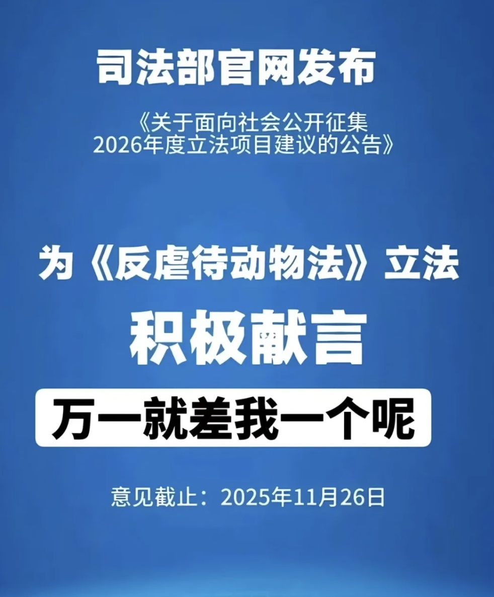 网友投稿中国司法部官方发布公告面向社会征集2026年度立法项目建议,网友呼吁请为无声的猫咪和狗狗们发封邮件,为《反虐待动物法》立法献言,截止日期11月26日。