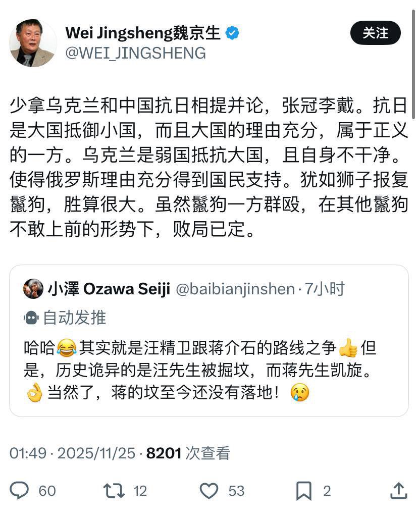 魏老師短短幾句話至少將四種不同的邏輯關係混成一鍋粥:1)中國抗戰與烏克蘭戰爭。2)大國與小國。3)正義與「不幹凈」。4)獅子與鬣狗。