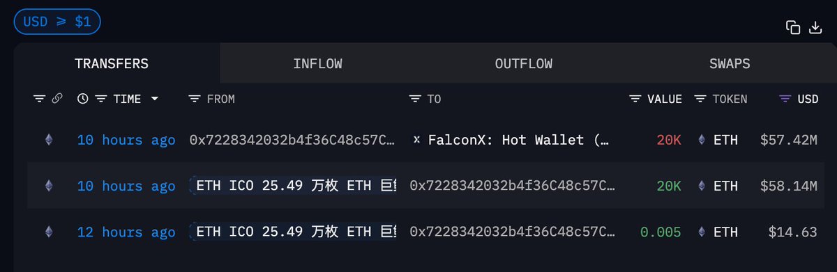 「ETH ICO 25.49 万枚的远古巨鲸」时隔八个月疑似抛售 20000 ETH,价值 5814 万美元,成本低至 0.31 美金😲10 小时前他已将 2 万枚 ETH 充值进 FalcoinX,充值价格 $2906.79,上一次该巨鲸向交易所转移代币时币价还只有 $1452.04目前他在链上仍持有 3070 ETH,价值 907 万美元;钱包地址