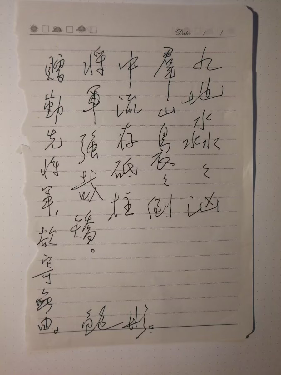 2020年前後,我在飯桌上告訴鮑老徐將軍已經失語,只能用眼球轉動來表達意思。鮑老非常關心,對將軍十來年不能和北京的夫人、子女共同生活非常悲憤。我問及鮑老給徐將軍寫過的一幅墨寶,鮑老回答已經託人送去。我從筆記本撕下一頁紙,請鮑老用簽字筆寫下內容,鮑老提筆就寫完,是首《五絕》。