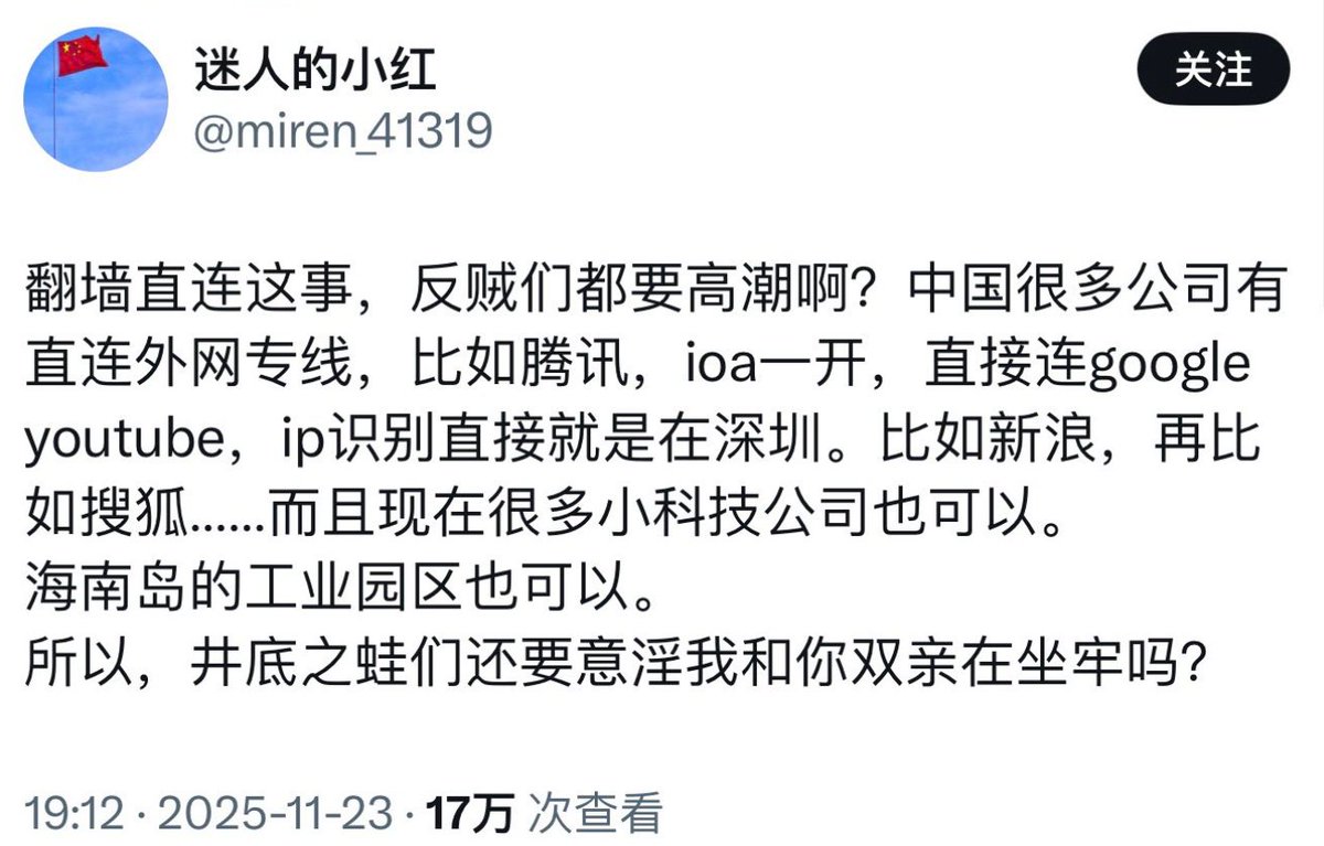 推特上有这么多国内的大厂程序员,甚至还有企业老板,到现在有一个人是中国直连IP的吗?没有。