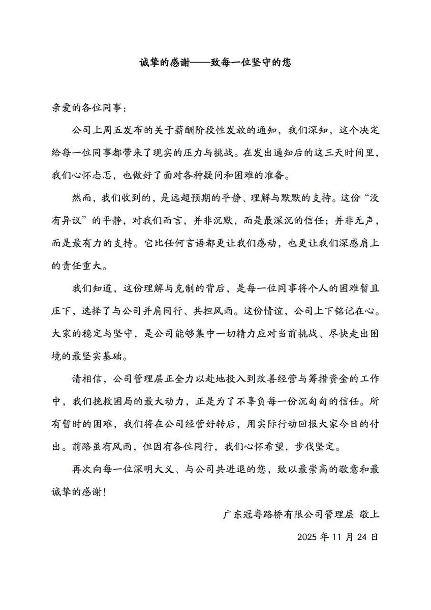 网友投稿:11月21日,广东冠粤路桥有限公司再次向全体员工下发通知: 自2025年10月起,公司每月仅先行发放“保障基本生活的部分薪酬”,剩余工资待公司资金状况好转后择期补发。