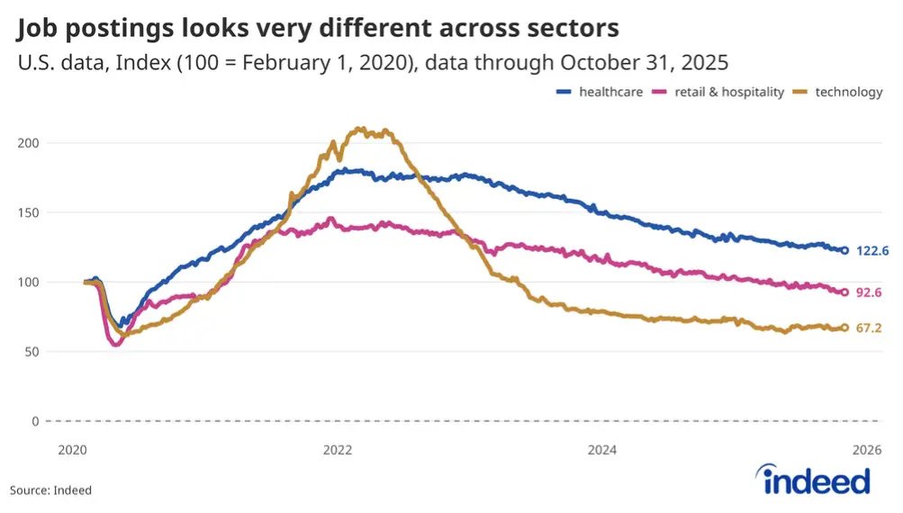 在科技行业内部,数据和分析领域尤为突出。截至今年10月底,这一领域的招聘指数跌至60,是Indeed追踪的所有行业中最低的。这意味着与疫情爆发前相比,数据分析相关岗位减少了整整40%。