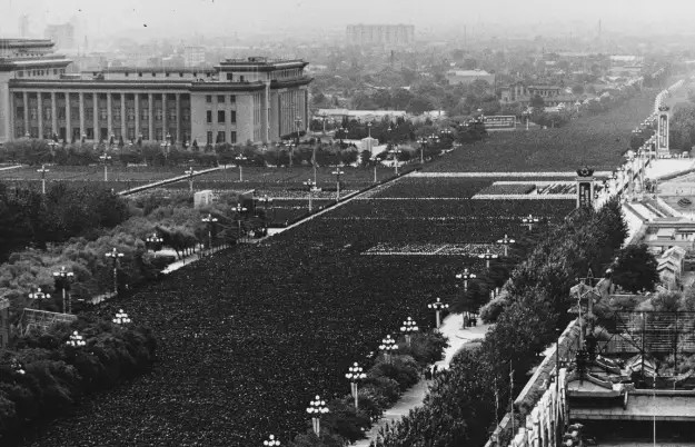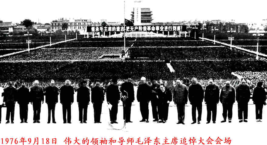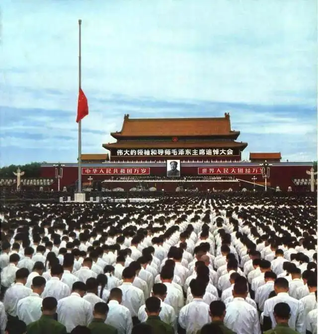 灵堂里摆放的花圈,好象是攀比似的,一个企业比一个企业做得精致、漂亮。在悼念活动结束后,我所在城市的博物馆还举行了一次花圈展览,就是将国有企业做的花圈集中起来供人参观,花花绿绿的一大堆花圈摆放在博物馆里,令人眼花缭乱。参加毛追悼大会的人数,理所当然地也创造了世界之最。追悼大会于9月18下午3时举行,主会场设在北京的天安门广场,全国各个省、市、县甚至更低一级的行政单位包括部队、厂矿、学校、医院,都设立了分会场。记得追悼大会举行的当天下午,天气异常炎热,我和同学们列对站在学校的大操坪里,通过广播收听北京传来的追悼大会的实况。在赤热而又毒烈的太阳曝晒下,有不少同学中暑倒下。后来,从市里的主会场(相对于学校分会场而言),也不断传来有人中暑倒下的消息。那天下午,工厂停工、学校停课、商店关门,中国历史上可能从来没有如此万人空巷过。这是不是又创造了一个世界之最?