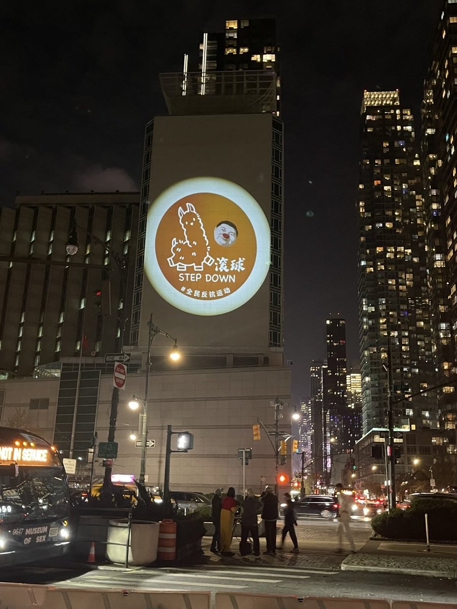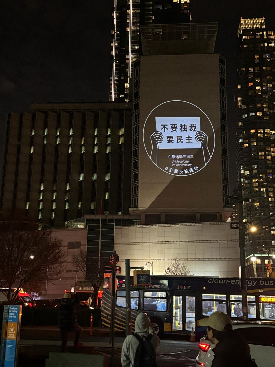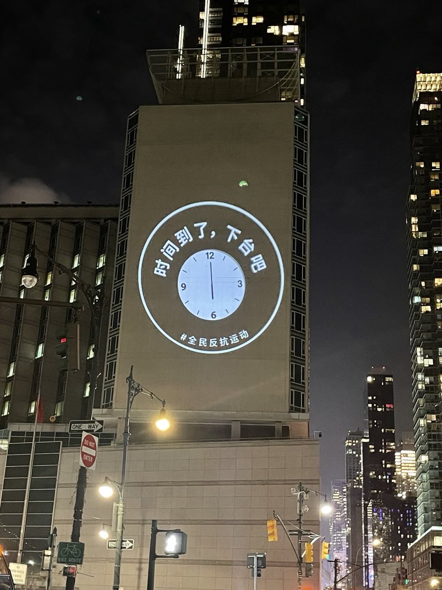 11月26日,纽约。“白纸运动”三周年纪念日当天, 美东时间晚20时,中华人民共和国驻纽约总领事馆外墙上惊现大型政治投影,内容包括要求中国领导人习近平下台及呼吁民主的标语。这是首次有组织公开以团体名义在中国驻外使领馆建筑上进行此类投影行动。