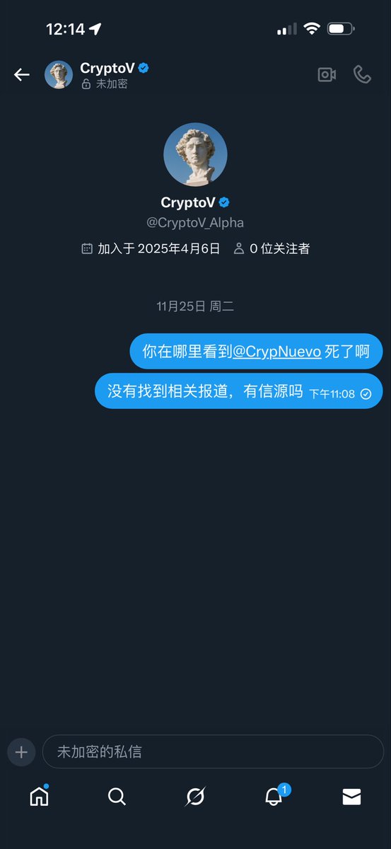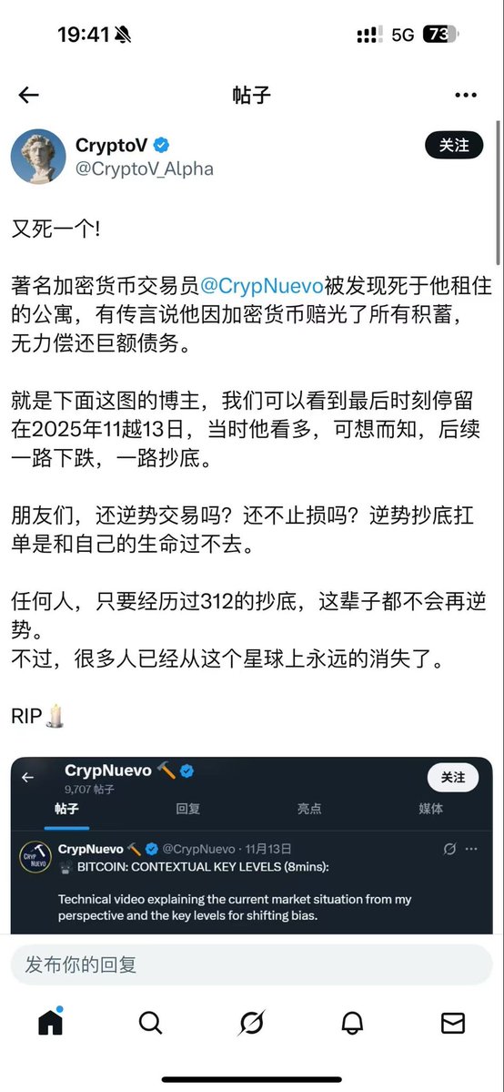 比如这个@CryptoV_Alpha 👆🏻前几天造谣海外一个大V @CrypNuevo 抄底然后死了,还言之凿凿的说因为无力偿还债务,然后加上一堆心灵鸡汤,截图在不少微信群里流传。