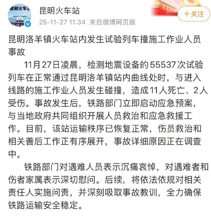 11月27日,昆明火车站 通报,检测地震设备的55537次试验列车在正常通过昆明洛羊镇站内曲线处时,与进入线路的施工作业人员发生碰撞,造成11人死亡、2人受伤。