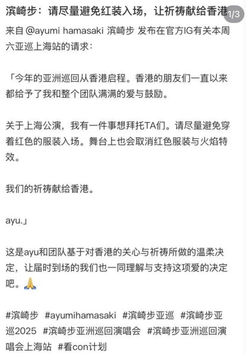 而就在演出被取消前,滨崎步在官方 IG 还在为了香港火灾祈祷和哀悼,请求观众尽量避免穿红色服装,取消舞台的红装和火焰特效: