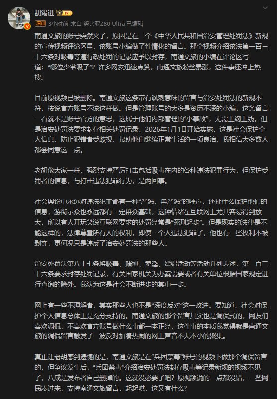 目前原视频已被删除。南通文旅这条带有讽刺意味的留言与治安处罚法的新规不符,按说官方账号不该这样做。但是管理账号的大多是资历不深的小编,这条留言一看就不是账号官方的意思,这属于他们内部管理的“小事故”,无需上纲上线。但是治安处罚法要求封存相关处罚记录,2026年1月1日开始实施,这是社会保护个人信息,防止犯错者受歧视,帮助他们继续正常生活的一项良治,我相信大多数人都会同意这一点。