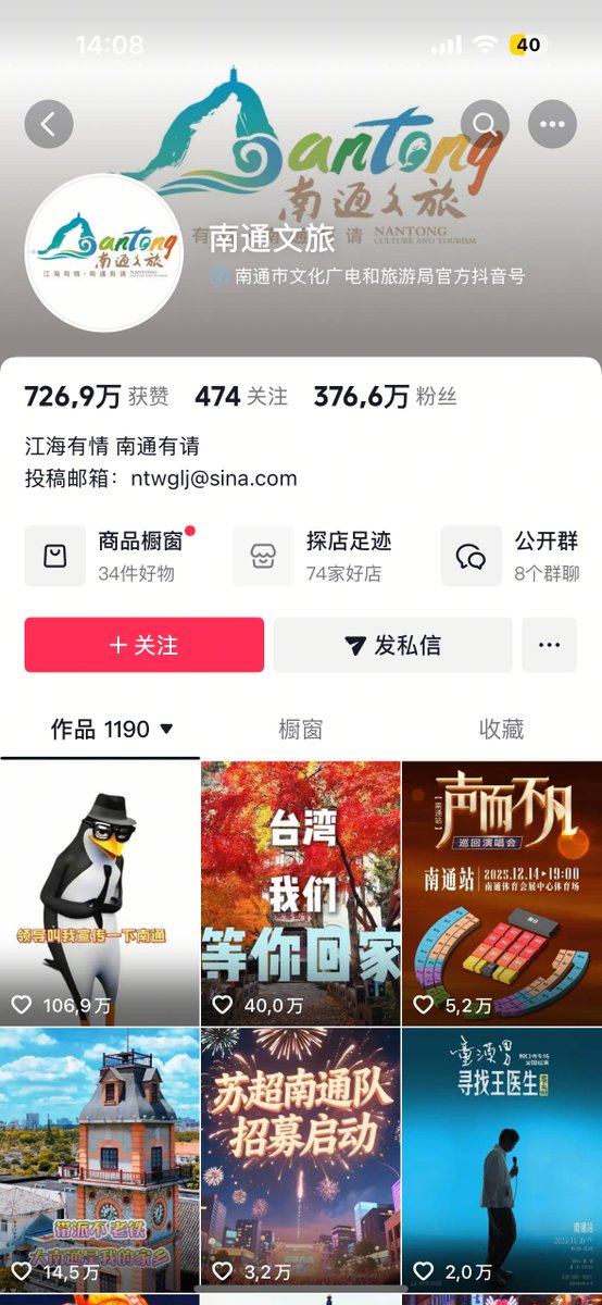 目前,南通文旅的账号粉丝增长至376.6 万,一句“哪位少爷吸了”使得该账号涨粉341.1 万。