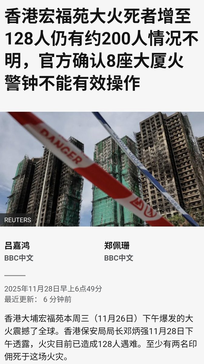 据BBC中文,#香港大埔火灾 死亡人数已增至128人,另外仍有200人失联