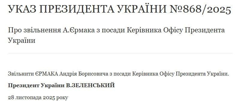澤連斯基解雇總統幕僚長葉爾馬克之前,葉爾馬克提出辭職。