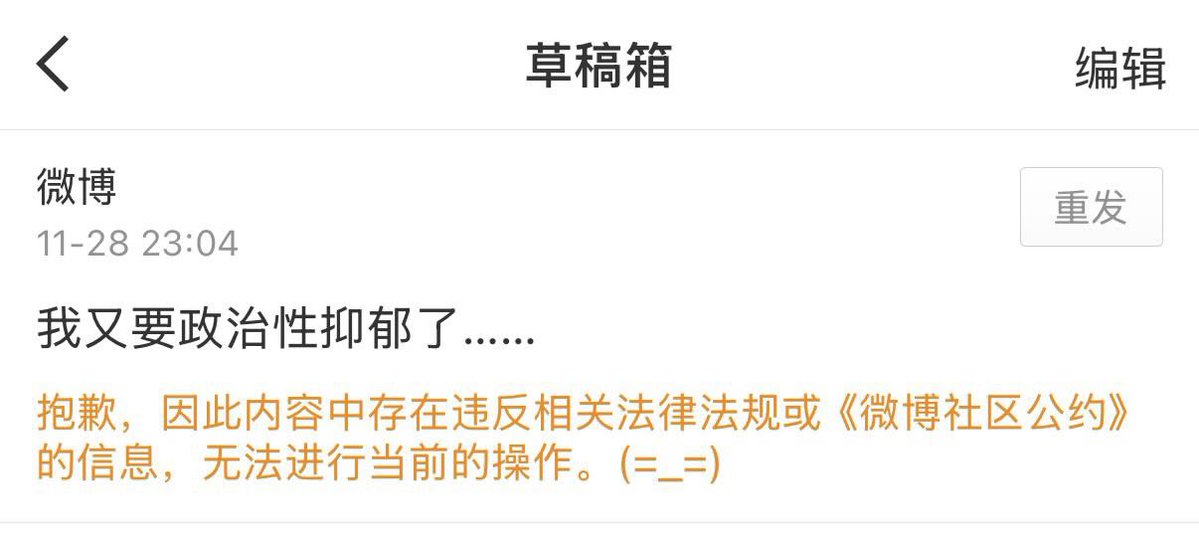 网友在微博连“我又要政治性抑郁了”这样一句话都发不出去啊!!!!