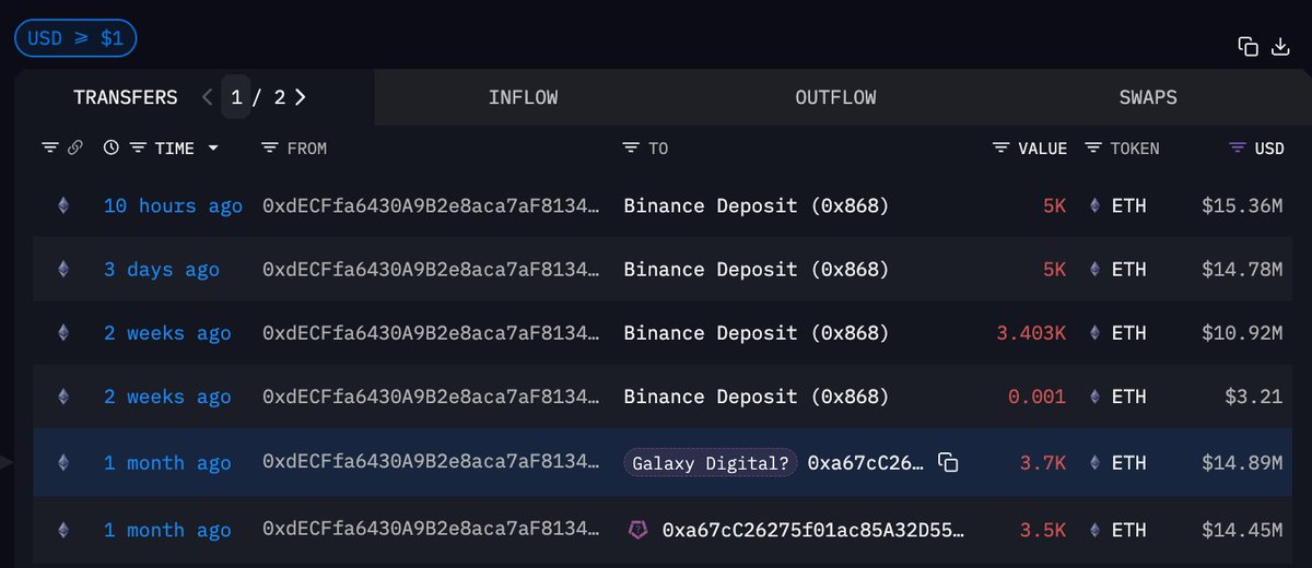 「四年前均价 $10708 建仓 1074 $WBTC 的地址」卖完 $WBTC 似乎开始卖 $ETH 了?他曾在今年七月以均价 $118011 止盈 1000 BTC 并获利 1.07 亿美元🤔10 小时前向 #Binance 充值 5000 ETH,价值 1536 万美元,过去 2 周他已累计向交易所充值 13403.28 枚,总价值达 4106 万美元该地址目前仍持有 1.5