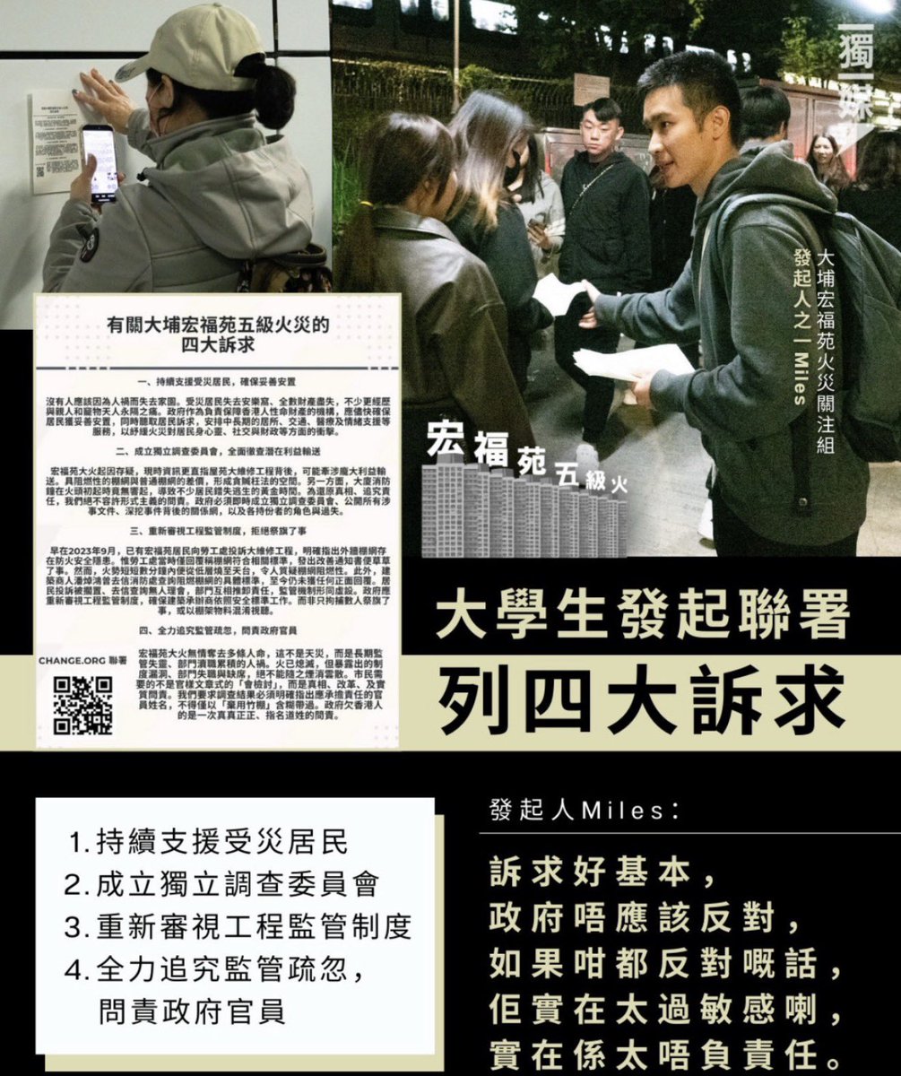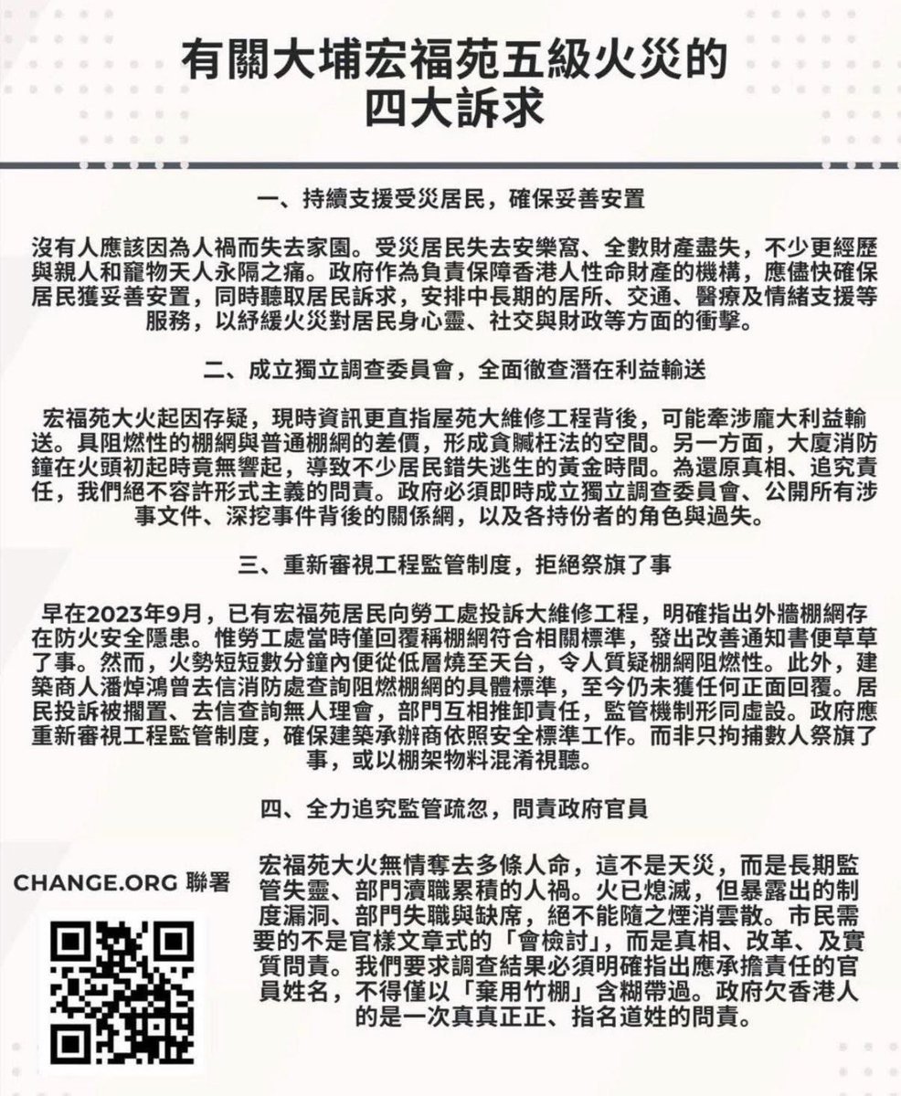 香港有民众,发起针对香港火灾的四大诉求在救灾的同时要求成立独立的调查委员会,彻查背后的利益输送,官员腐败