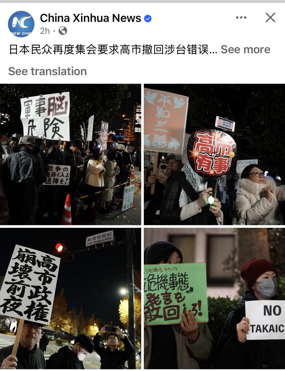 新華社真敢寫,在民主的日本,這幾個人抗議叫「集會」?即使「集會」在日本也不會被認定「反黨」、「反人民」。