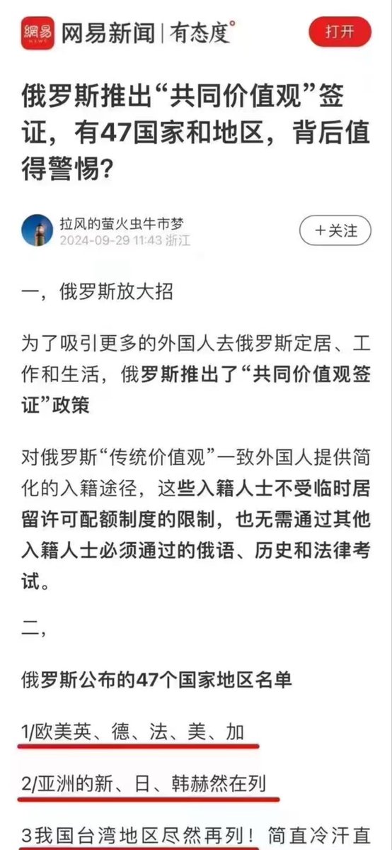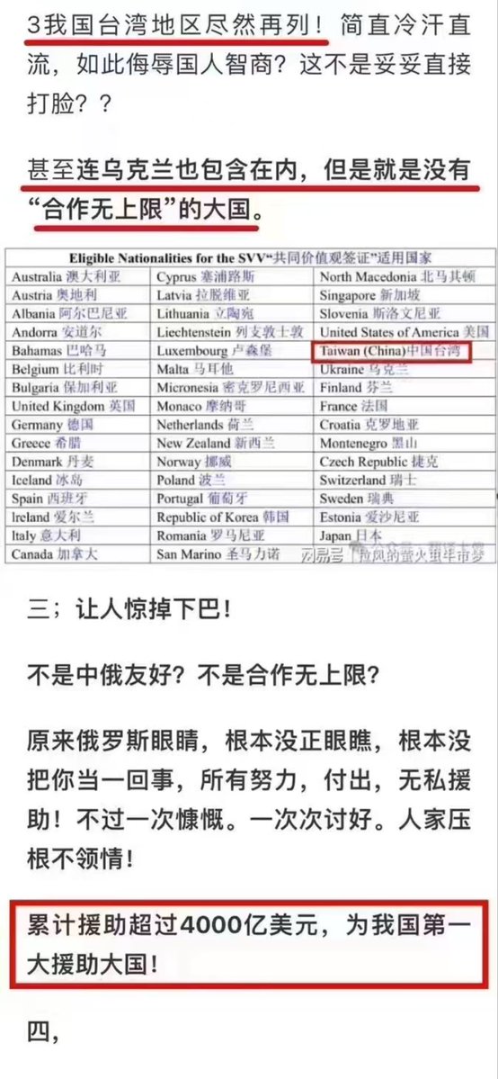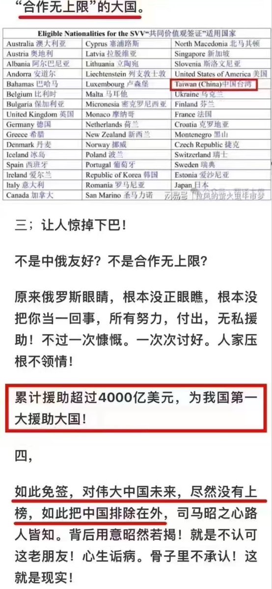 俄罗斯宣布对57国实行“共同价值观免签”,包括欧盟、美国和正在打仗的乌克兰,以及台湾地区,独独没有“合作无上限,援助四千亿”的中国,这脸打得啪啪响。战争还没结束,普京已经与中国划清界限了。这北京二傻子得多窝心啊!😁😁