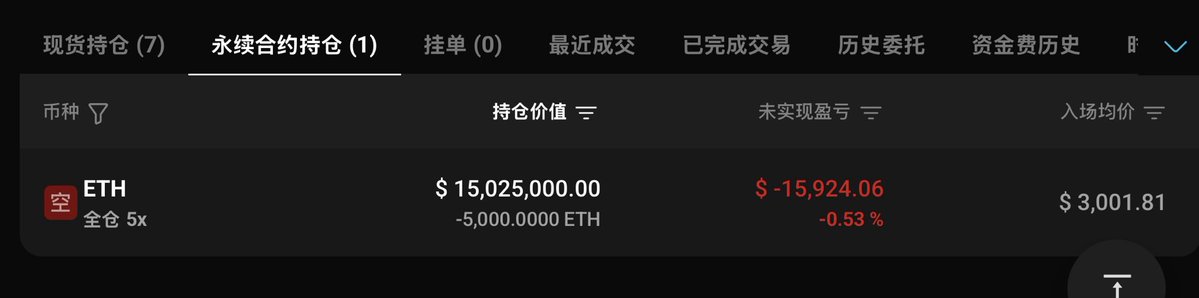 「1011 开空内幕大佬」昨日平多后,已调转方向 5x 做空 $ETH !不过看起来只是建了个头仓,或许还在观望中:目前持仓 5000 枚 ETH,价值 1502 万美元,开仓价 $3001.81传送门