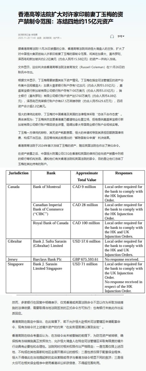 11月28日,澎湃新闻报道:11 月 26 日,香港高院同意恒大清盘人申请,将许家印前妻丁玉梅约 2.2 亿美元的境外资产纳入冻结,涉及加拿大、直布罗陀、泽西岛、新加坡等地。其主要资产为:加拿大皇家银行 1 亿加元、新加坡嘉盛莱宝 7100 万美元、直布罗陀瑞银 5760 万美元、泽西岛巴克莱 67.5 万英镑。 恒大称她在港英法律程序中不配合;丁玉梅否认转移资产。因境外银行无法直接执行港英命令,香港高院允许恒大赴各地申请当地法院的配套冻结令,且冻结范围受严格限制。