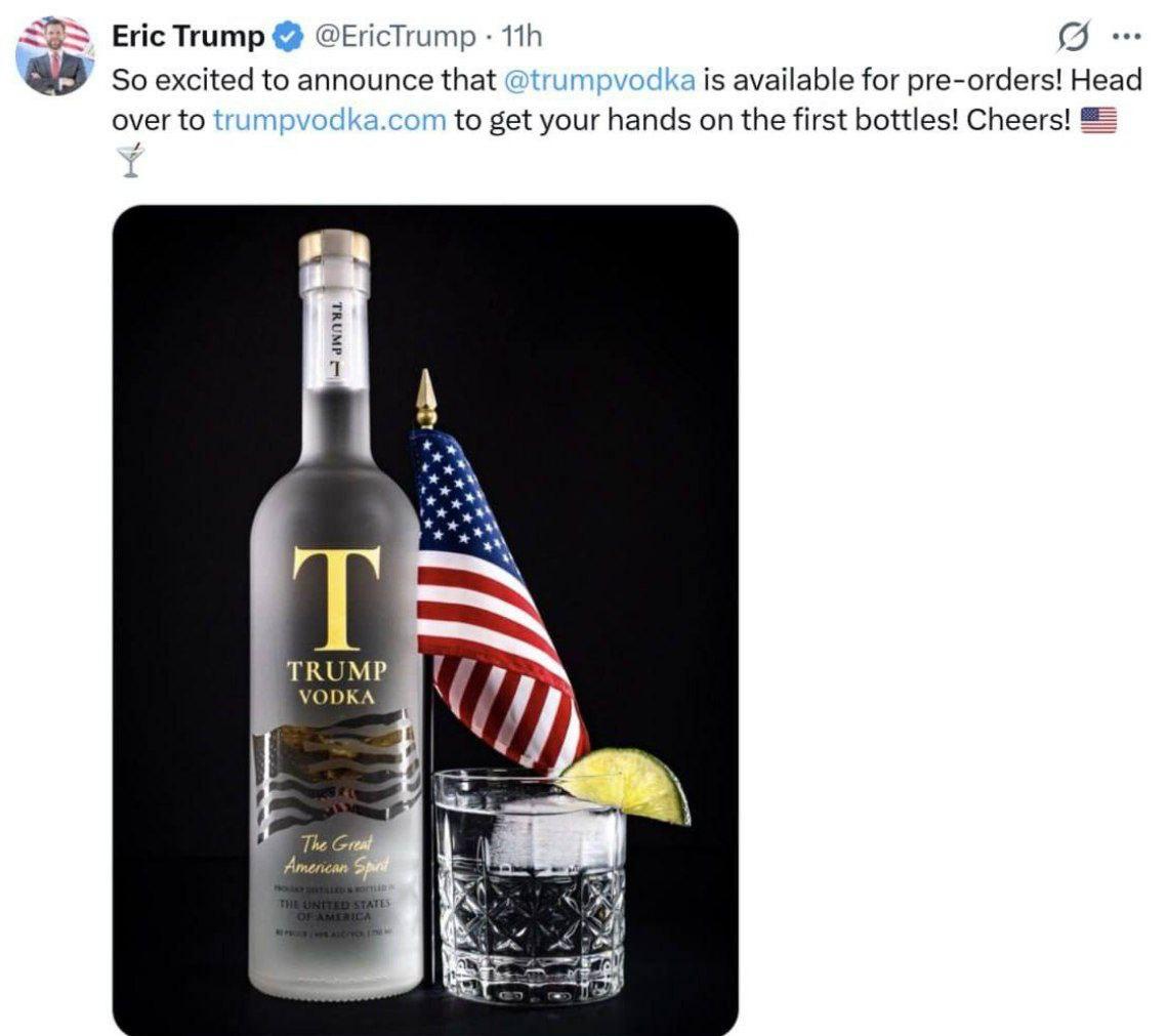 Trump’s son has unveiled a new vodka brand (apparently for “important negotiations” with the Russians) — “Trump Vodka”.Trying to win over Dmitry Medvedev?