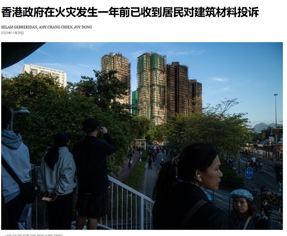 据纽约时报报道,早在2024年9月,香港宏福苑居民就已向市政府反映指出,维修工程中使用的材料可能不符合阻燃标准。但劳工处驳回了居民对防护网的担忧,随后又根据承建商提交的文件,告知居民施工材料符合消防要求。