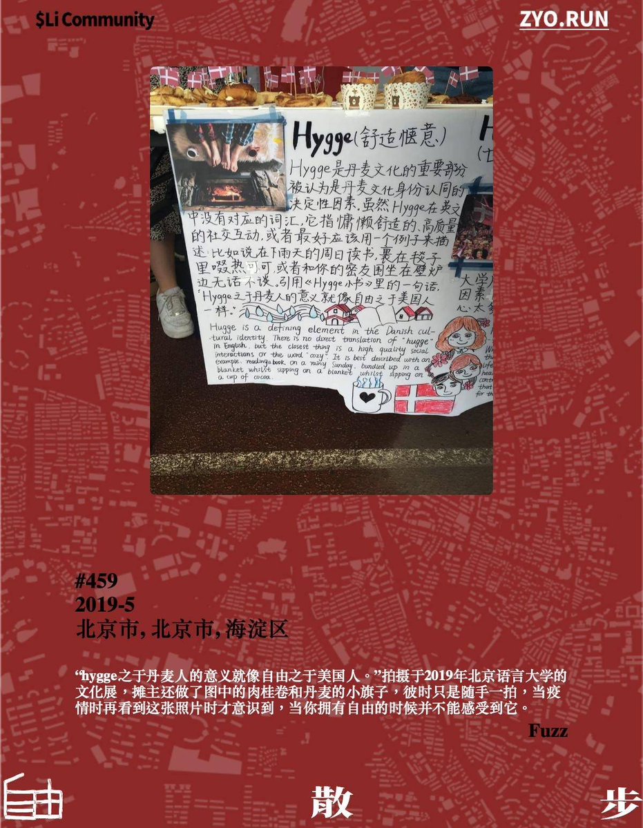 #自由散步“hygge之于丹麦人的意义就像自由之于美国人。”拍摄于2019年北京语言大学的文化展,摊主还做了图中的肉桂卷和丹麦的小旗子,彼时只是随手一拍,当疫情时再看到这张照片时才意识到,当你拥有自由的时候并不能感受到它。