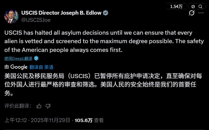 11月29日,美国移民局(USCIS)局长 Joseph B. Edlow 的官方 X 账号发布声明:美国移民局已暂停所有庇护申请决定,直至确保每一个入境的外国人都经过最严格的审查与筛选。美国人民的安全始终是我们的首要责任”。