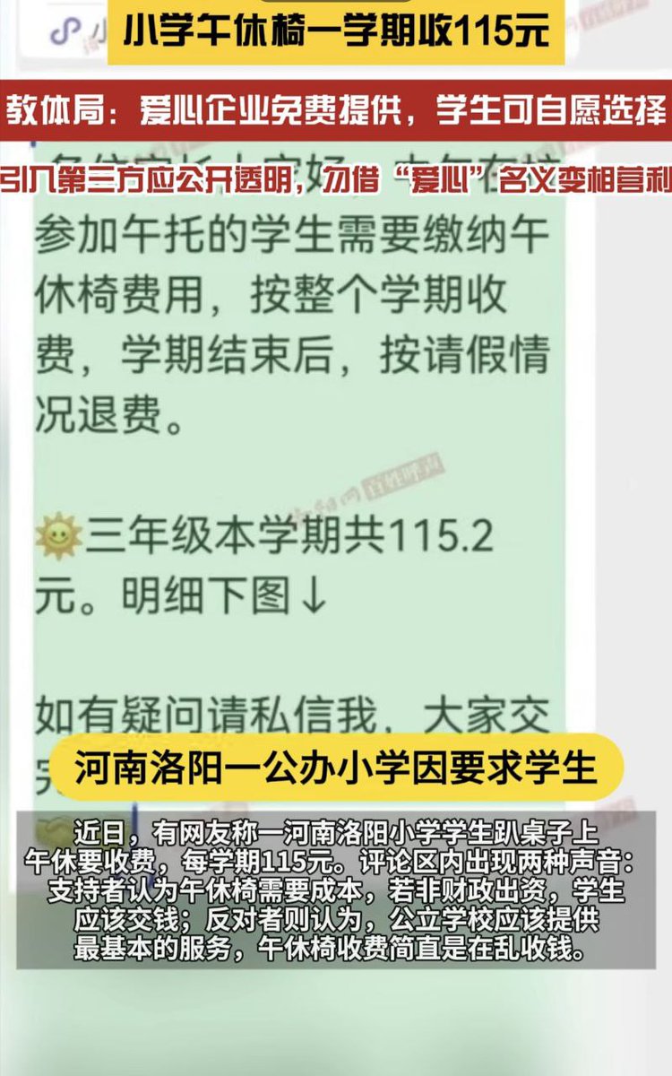 11月下旬,有网友称一河南洛阳小学学生趴桌子上午休要收费,每学期115元。教体局:爱心企业免费提供,学生可"自愿"选择。