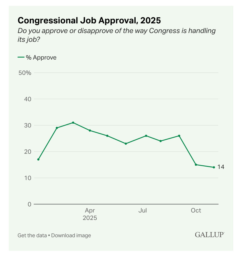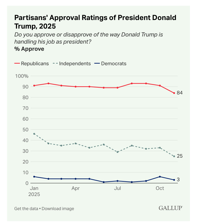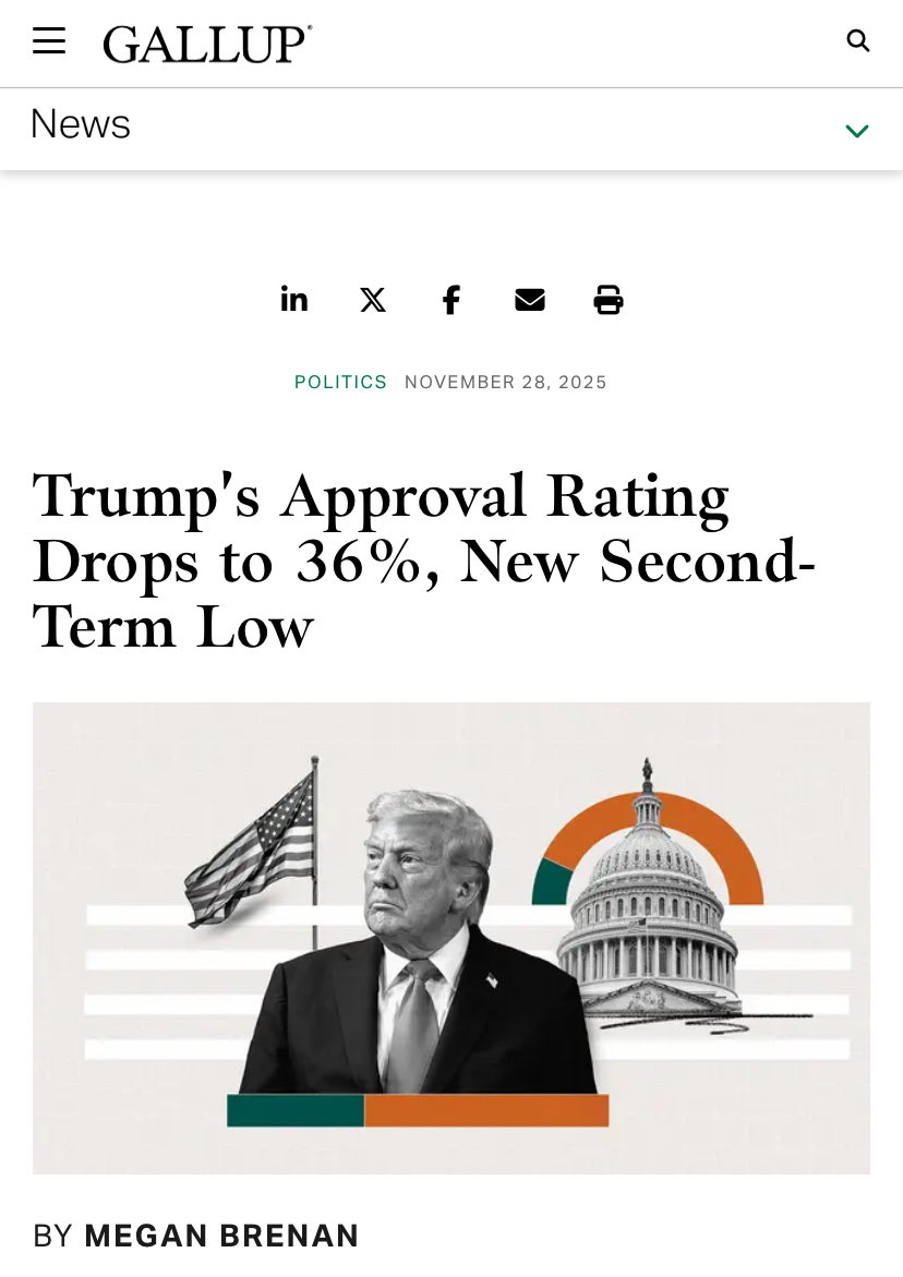 盖洛普最新民调,特朗普的工作认可度降至第二个任期的最低点:36%,中间选民和共和党的支持度都在下降!数据来自11月3号至25号,这中间经历了地方选举、美国历史上最长的政府关门。民调还发现,美国民众对国会的满意度降至14%。民调的链接:——我们还有三年多的时间要熬!