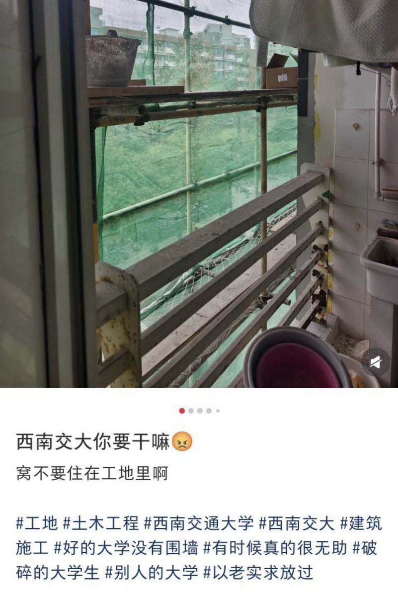 网友投稿有网友举报,成都西南交通大学党委书记余敏明、党委副书记闫学东在筹备“130周年校庆”期间推进校园大规模装修施工,自10月起大量工程进入学生宿舍周边,导致学生长期生活在脚手架和施工环境中。投稿者称,施工产生的粉尘、甲醛等刺激性气体使不少学生出现头晕、头痛、流鼻血、咳嗽等不适。