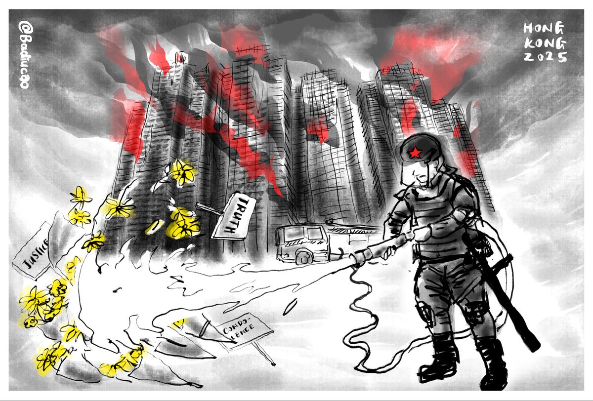 Cartoon on how HK authority deals with deadly the deadly blaze in Tai Po.漫画香港《如此灭火》