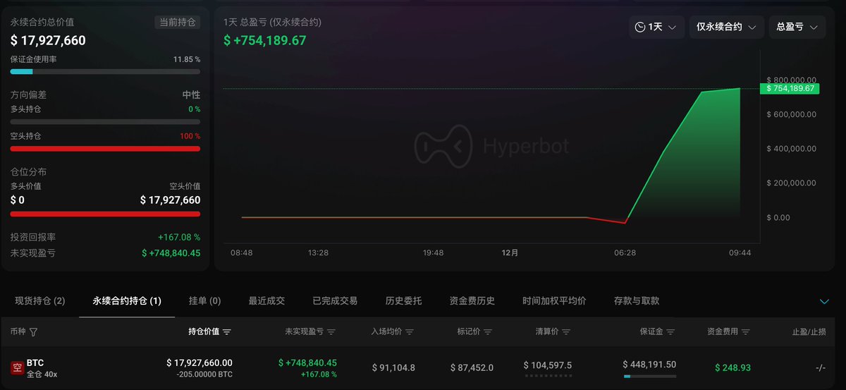 4 小时浮盈 75 万刀,it's all about timing⏳地址 0xfc7...d7e77 在 $BTC 91,150 美元时开启空单,目前持仓 205 枚(1792 万美元),平均开仓价 $91,104.8,目前浮盈 74.8 万美元有趣的是,这位朋友自 11.21 以来 6 次交易均为空单,且截止目前胜率 100%传送门 👉