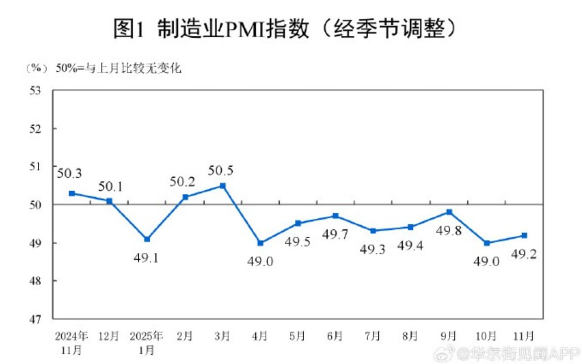 11月,中国官方制造业PMI为49.2,仍低于50处于收缩区间 。