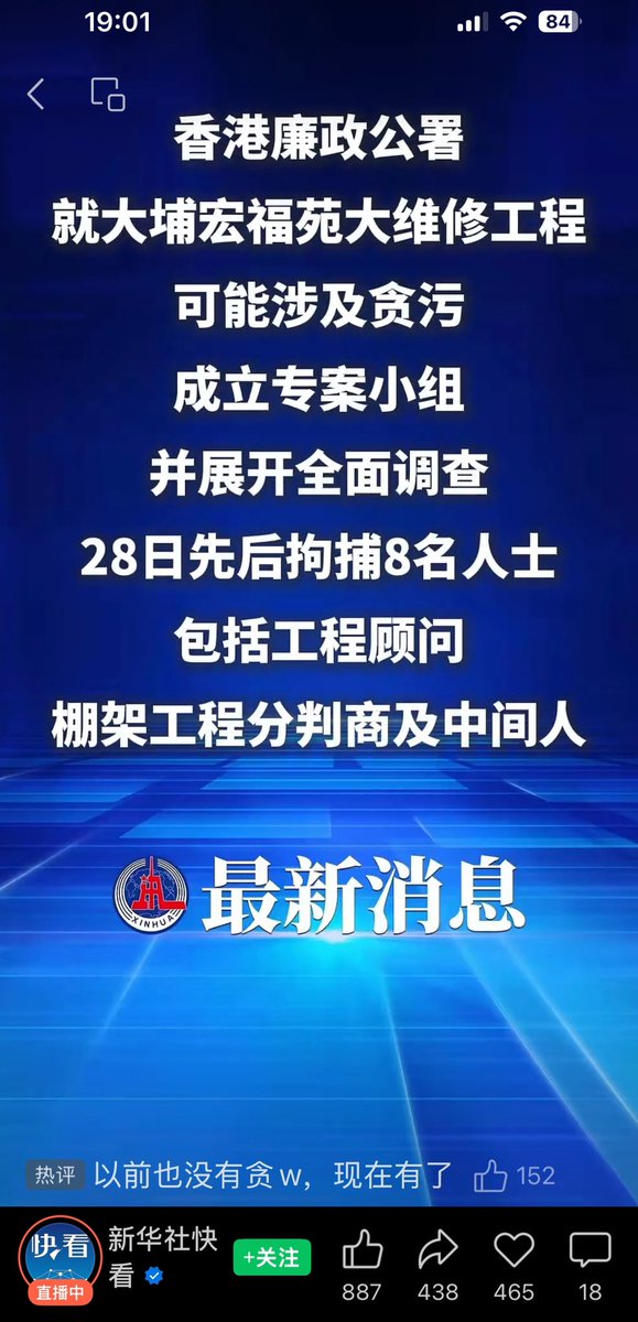 新华社最新消息:香港廉政公署拘捕8人,罪名是涉嫌宏福苑维修工程贪污,其中包括工程顾问、棚架工程分判商和中间人。湖北日报消息:廉政公署拘捕13人,罪名是误杀。在着火大楼采集了7处棚网样本,没有达到阻燃要求。看看新闻:廉政公署拘捕12人,罪名是涉嫌工程贪污,拘捕13人,罪名是涉嫌误杀。
