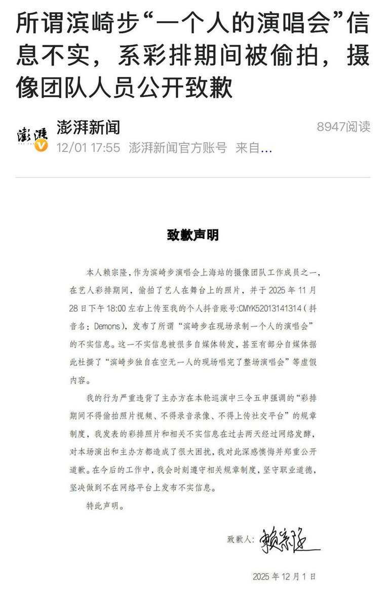 12月1日,澎湃新闻称:所谓滨崎步“一个人的演唱会”信息不实,系彩排期间被偷拍,摄像团队人员公开致歉