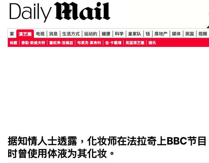 曾主持過BBC節目的歷史學家麗莎.希爾頓揭露,當英國唯一的保守派政黨---改革黨黨首法拉奇上BBC節目時,化妝師是使用被“各種人體排泄液體”蘸過的化妝筆化妝的。