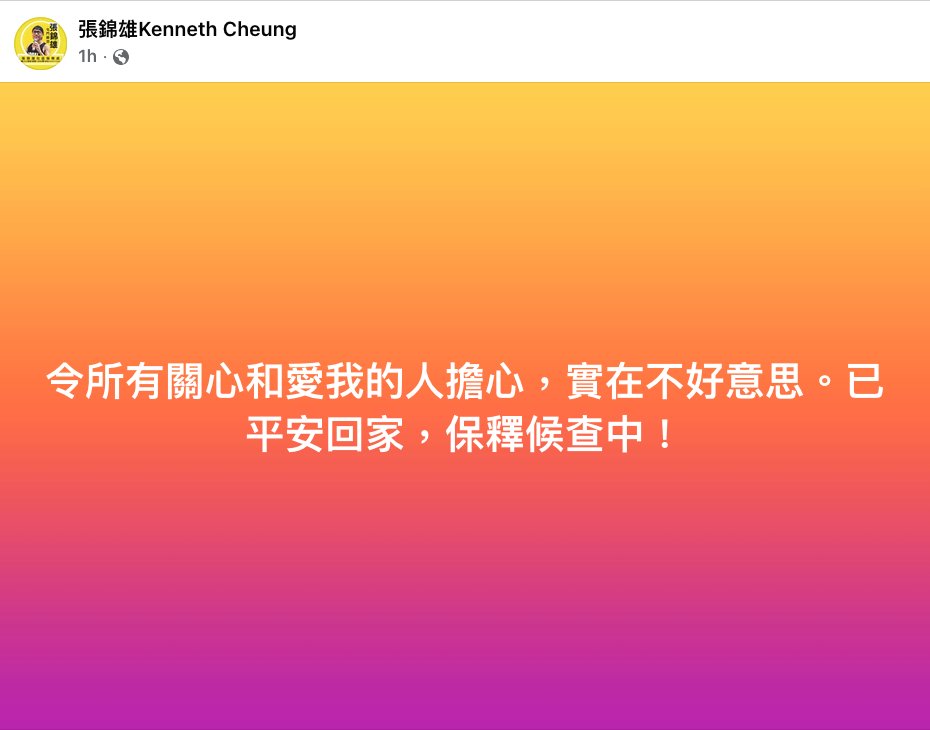 Former pro-democracy District Councillor Ken Cheung (張錦雄), like Miles Kwan arrested for #sedition, has also been released: "So sorry to have worried everyone who cares about & loves me. I'm safely home & out on bail pending further investigation!"