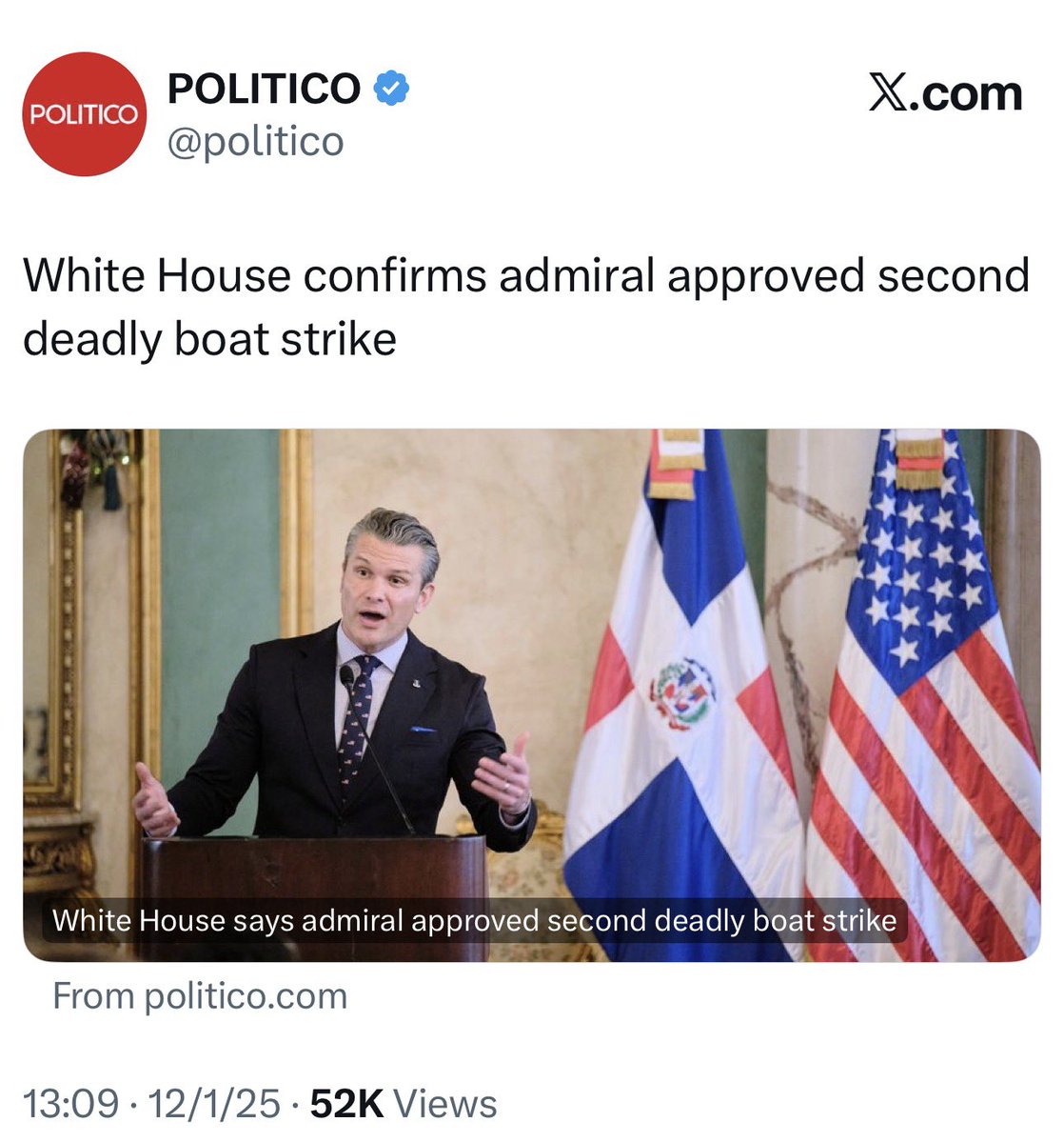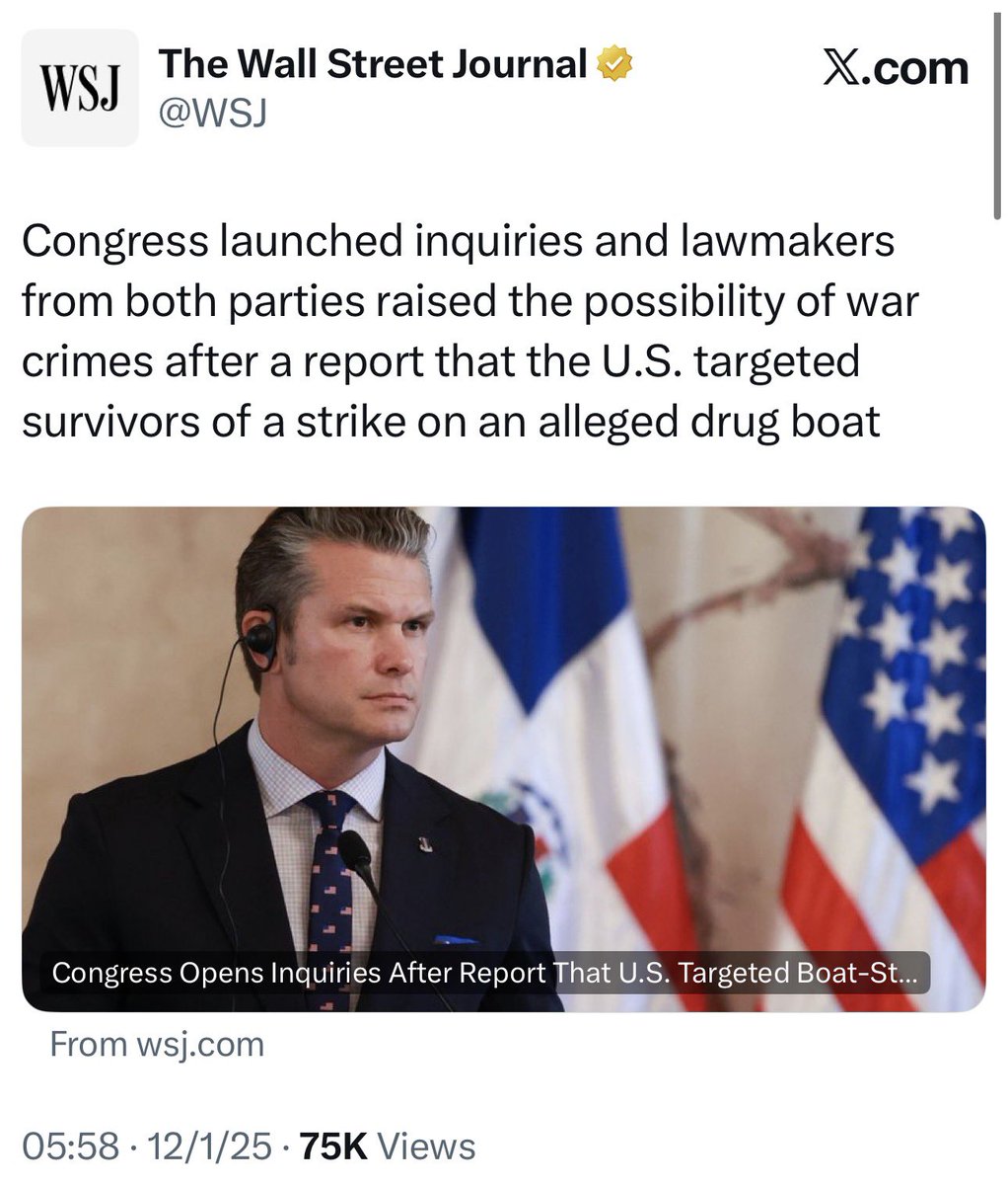 美國戰爭部長霍格塞斯攤上大事了。華郵爆料,9月2日美軍導彈擊中一艘快艇後,發現有兩名存活者漂浮;於是,霍格塞斯下令不留活口之後,美軍第二次發射導彈殺死了兩名存活者。今天白宮承認是一名海軍上將下令二次導彈攻擊,並非霍格塞斯下令。同時,白宮辯解稱沒做錯。美國兩黨國會議員都表示要調查此事。