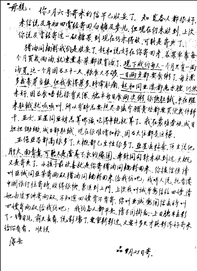 猪油同面粉我们是收妥了,超和说好在你寄回来,若果单靠每月买几两油, 就连煮条菜都没有油了。现下我们每人一个月只有一两油买。这个月因为三十一天,粮食又不够,一日两餐都要食粥了。每餐煮多几条菜当饭。但我食得菜多,时常肚痛。超和同亚婆都患水肿,仍然未好。因为吃唔饱很有关系。穗丰每日食两次粥,很快肚饿,半夜醒来肚饿就呱呱叫。所以有时总要想尽办法宁愿贵一些都要买□几件饼干。亚女,亚星同亚妹总算听话,吃得半饱就算了。我在农场劳动,成日担担锄锄,成日都肚饿。现在很难增加粮。因为大伙都是这样。