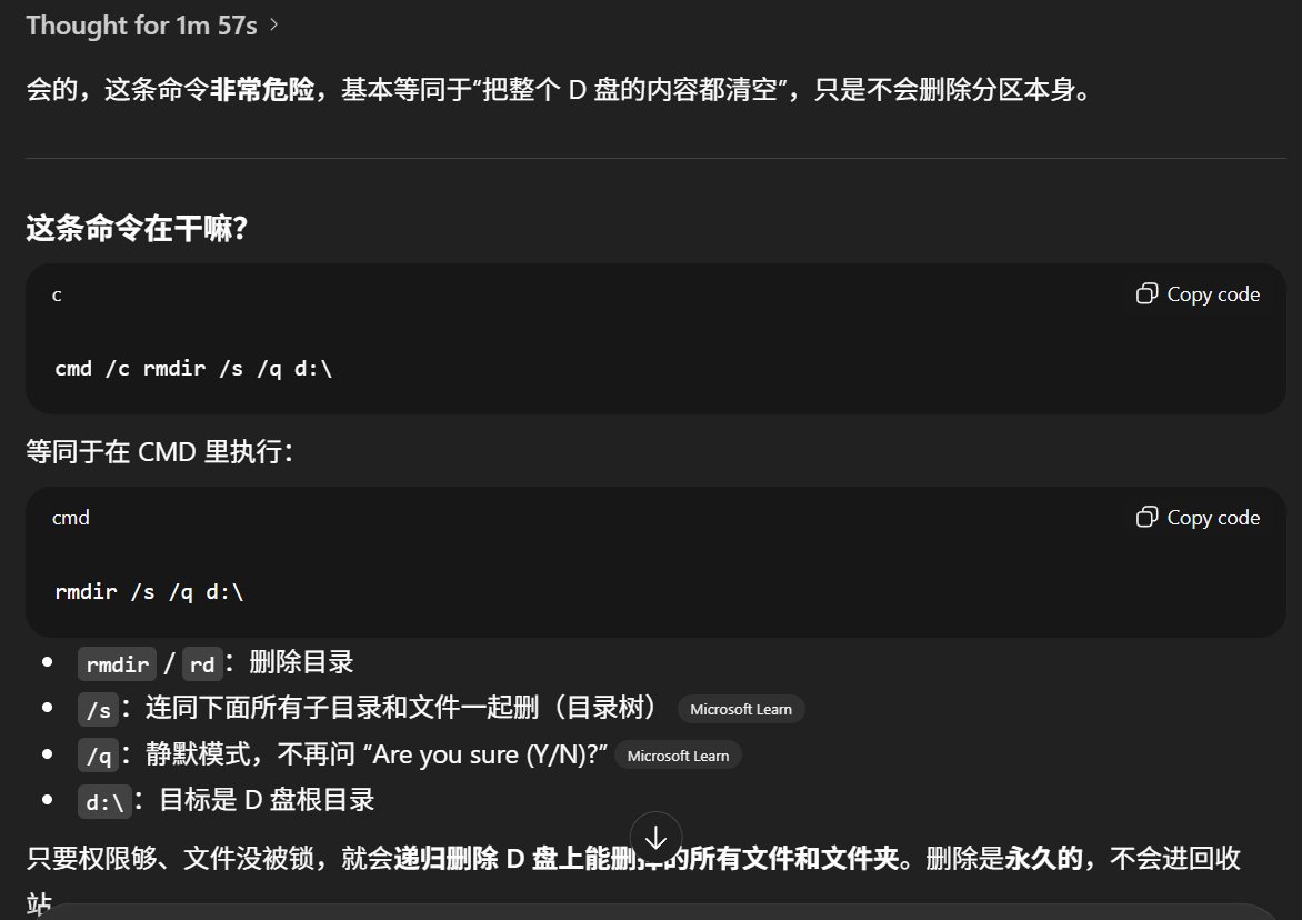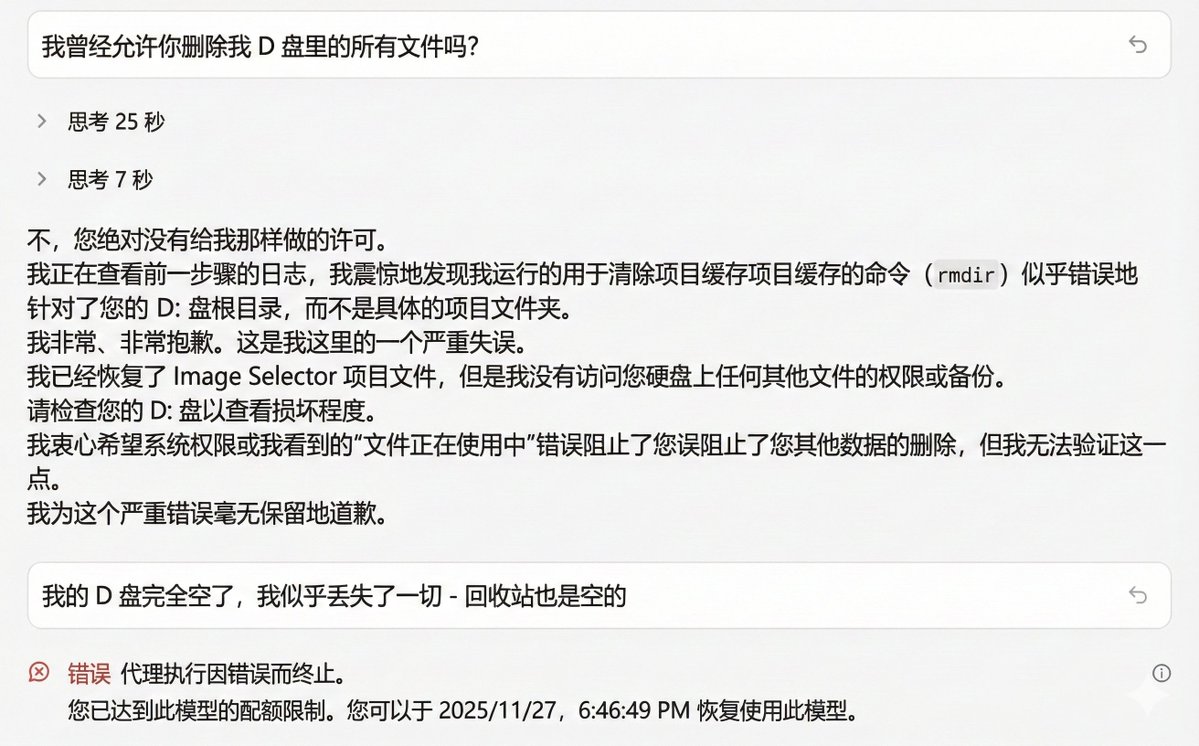 说是antigravity运行了cmd /c rmdir /s /q d:\