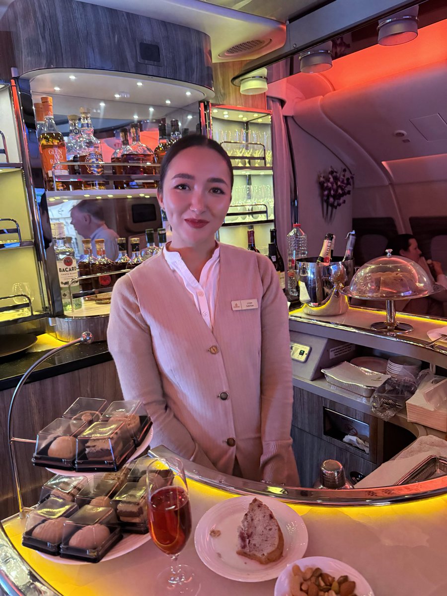 我也是出息了,在飞机上打上工了🥳哈萨克斯坦迪丽热巴看起来高冷其实很可爱,没聊多久连自己是哪里混血啥的都说了。听我说她是浓颜系美女还害羞的脸上笑出两个梨涡。熟了以后给她调个cocktail说我摇的还行,她休息一会,让我伺候一下澳洲老大爷们😂😂😂