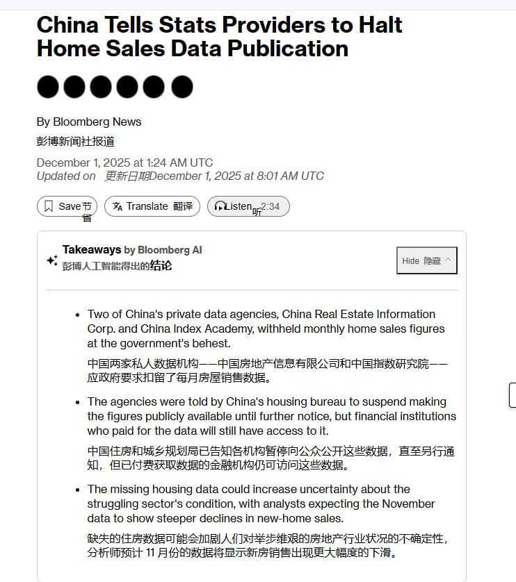 12月1日,彭博社报道:中国两家私人数据机构,中国房地产信息有限公司和中国指数研究院,应政府要求扣留了每月房屋销售数据。中国住房和城乡规划局已告知各机构暂停向公众公开这些数据,直至另行通知。
