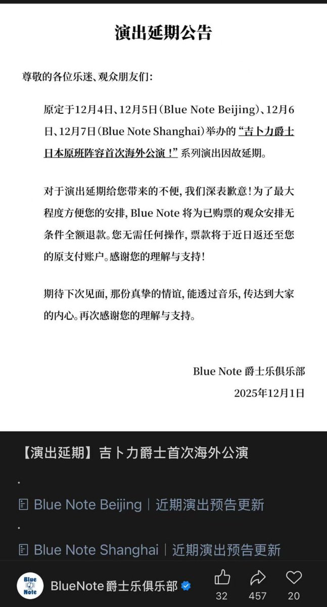 网友投稿:Blue Note Beijing 和 Blue Note Shanghai相继取消或延期了一些近期日本艺人的演出。