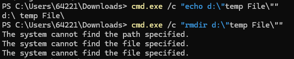 3.这样rmdir d:\"temp files"变成了 rmdir d:\ temp File\. powershell是当成了3个目录一起rm