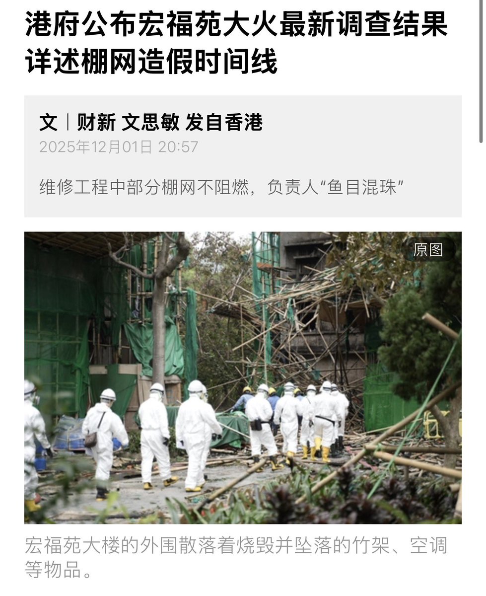 阻燃网or竹子是罪魁祸首,已有定论根据保安局及廉政公署消息施工方的阻燃网未达阻燃标准,同时为了应付检查施工方还购买了部分合格产品,将这些产品安装在大楼底部竹架桩脚等显眼位置,以此糊弄检查而使用劣质棚网,仅节省了10.58万港元