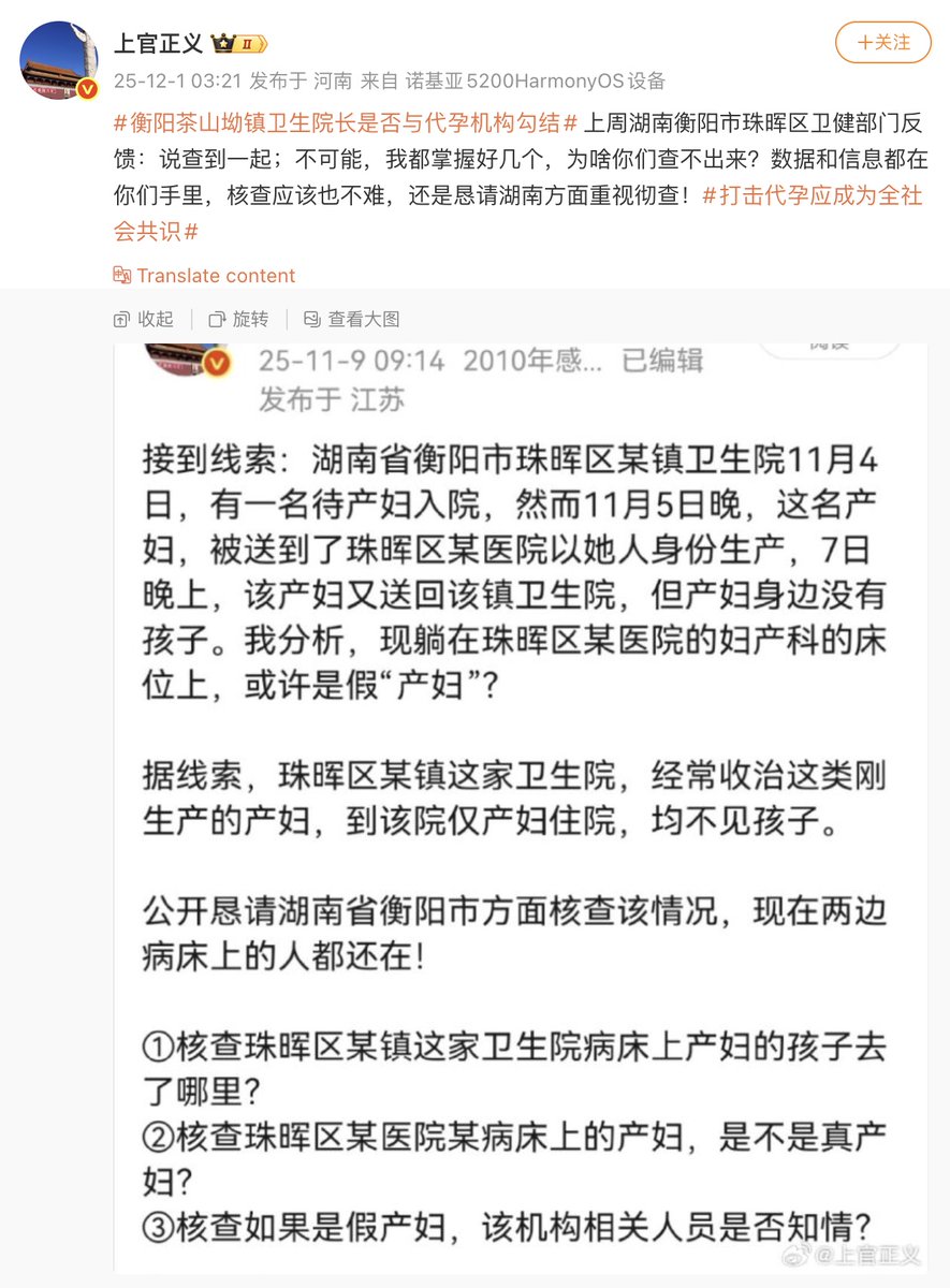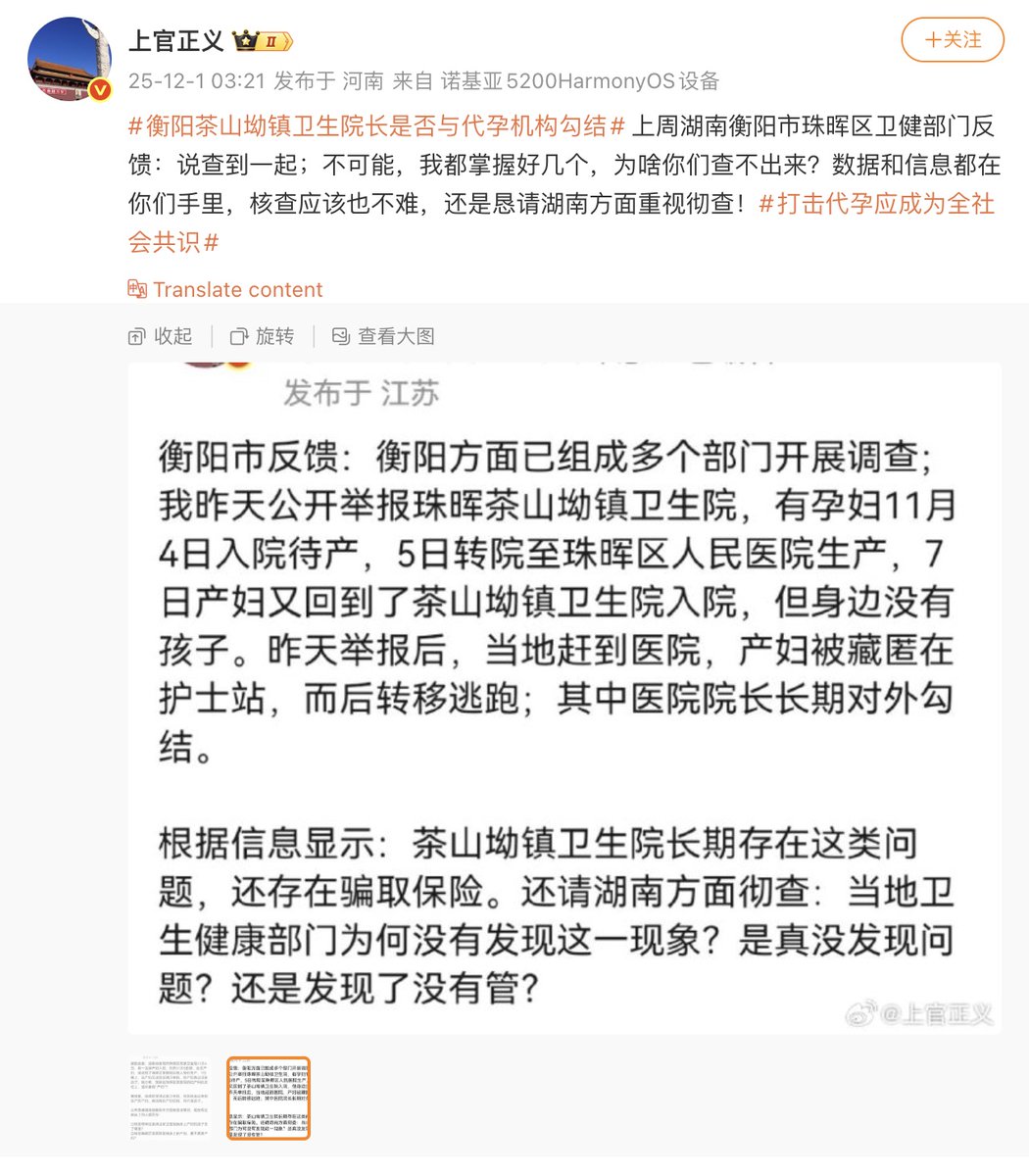 12月1日,打拐志愿者“上官正义”发帖称,湖南衡阳珠晖区茶山坳镇卫生院疑似长期与代孕机构勾结,存在“真孕妇、假产妇、无婴儿”的可疑生产链条。