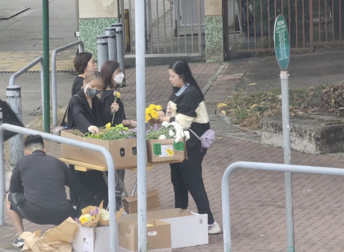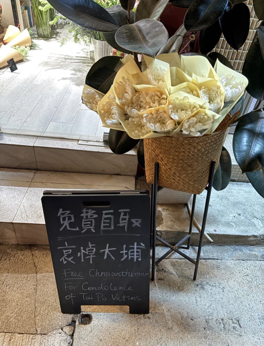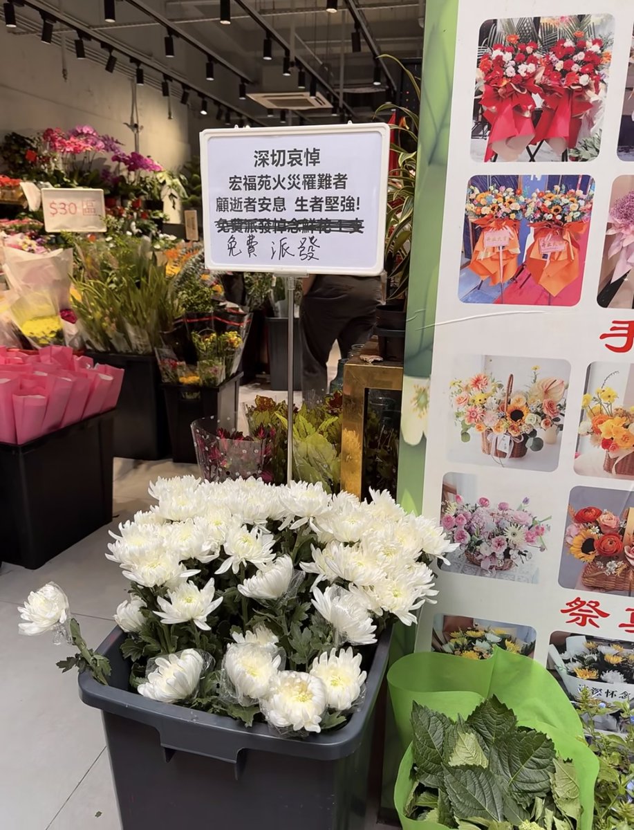12月1日,香港火灾后,不少花店自发向香港市民无偿提供哀悼之花。街头也出现义工向路人分发鲜花,供路人前往悼念逝者。