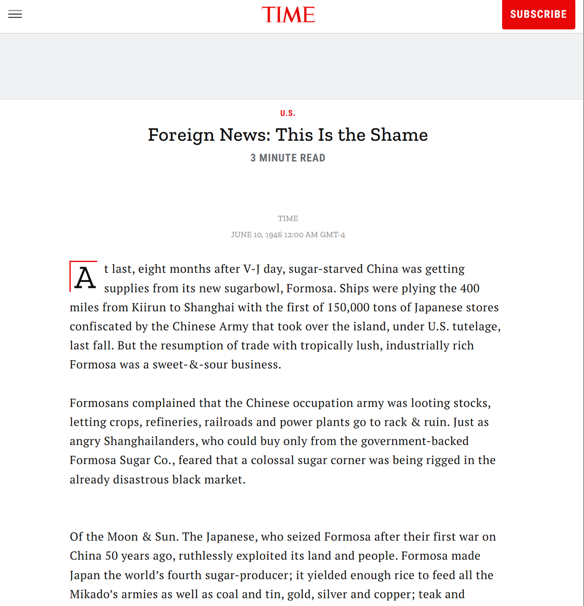 時代:"大多數在台灣的外國觀察家都同意,如果今天舉行公民投票,台灣會投票支持美國統治。第二選擇是日本"